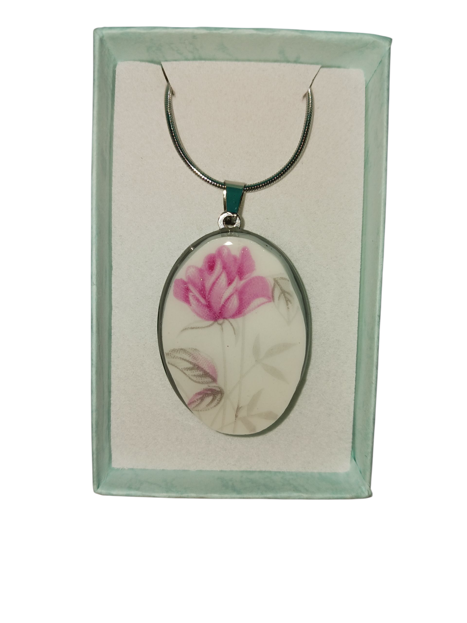 Collier en acier inoxydable avec morceau de vaisselle recouvert de résine.