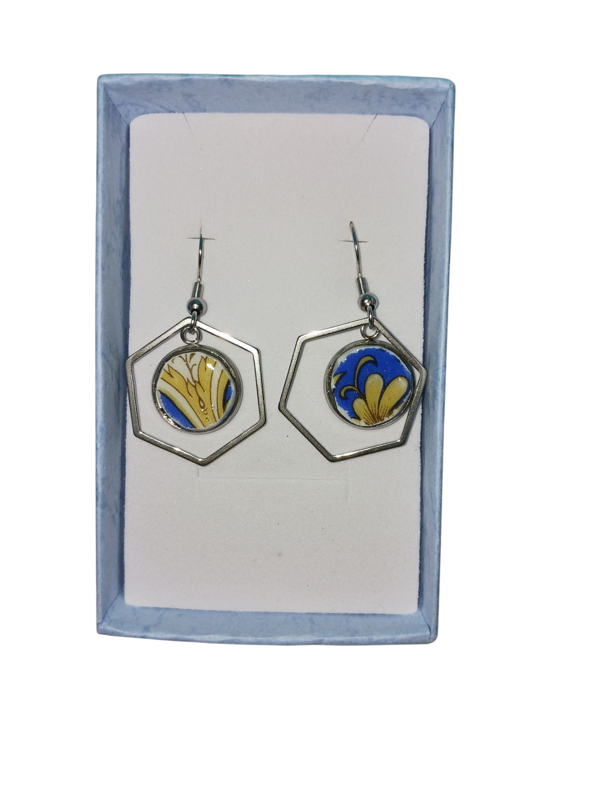 Boucles d'oreilles en acier inoxydable avec morceau de vaisselle recouvert de résine.