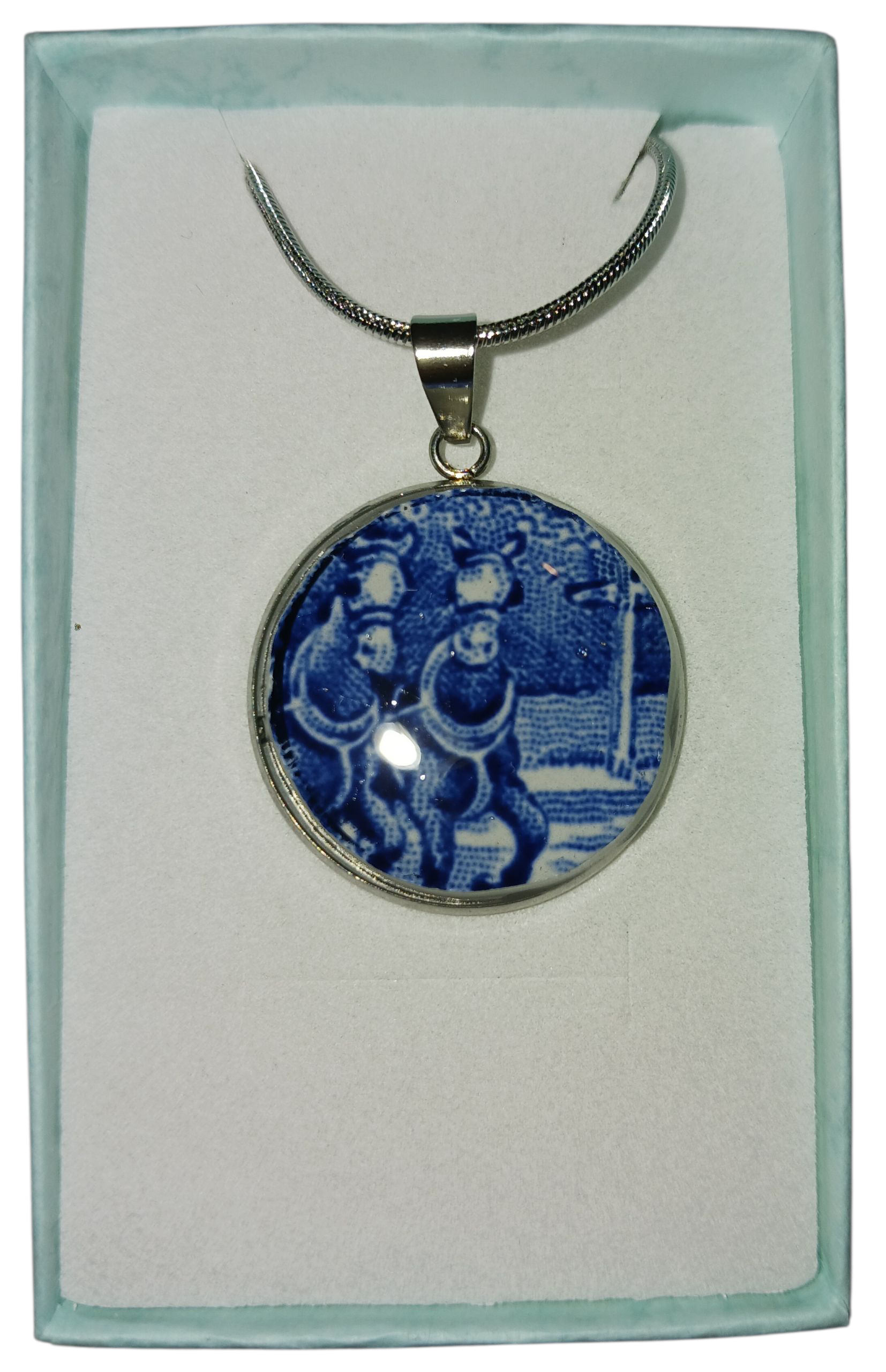 Collier en acier inoxydable avec morceau de vaisselle Anglaise recouvert de résine pour une meilleure protection.