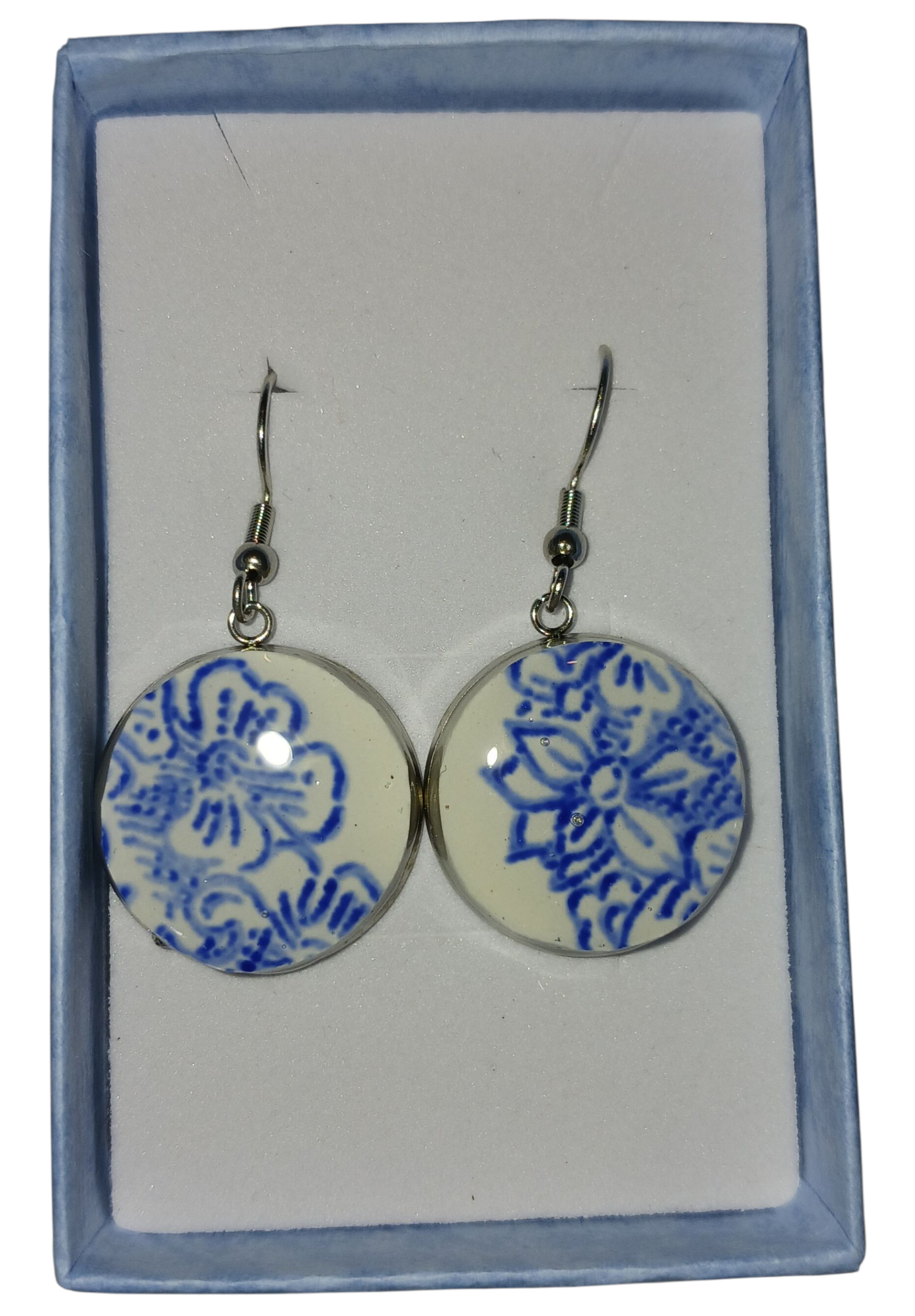 Boucles d'oreilles en acier inoxydable avec morceau de vaisselle bleu style anglais recouvert de résine pour une meilleure protection.
