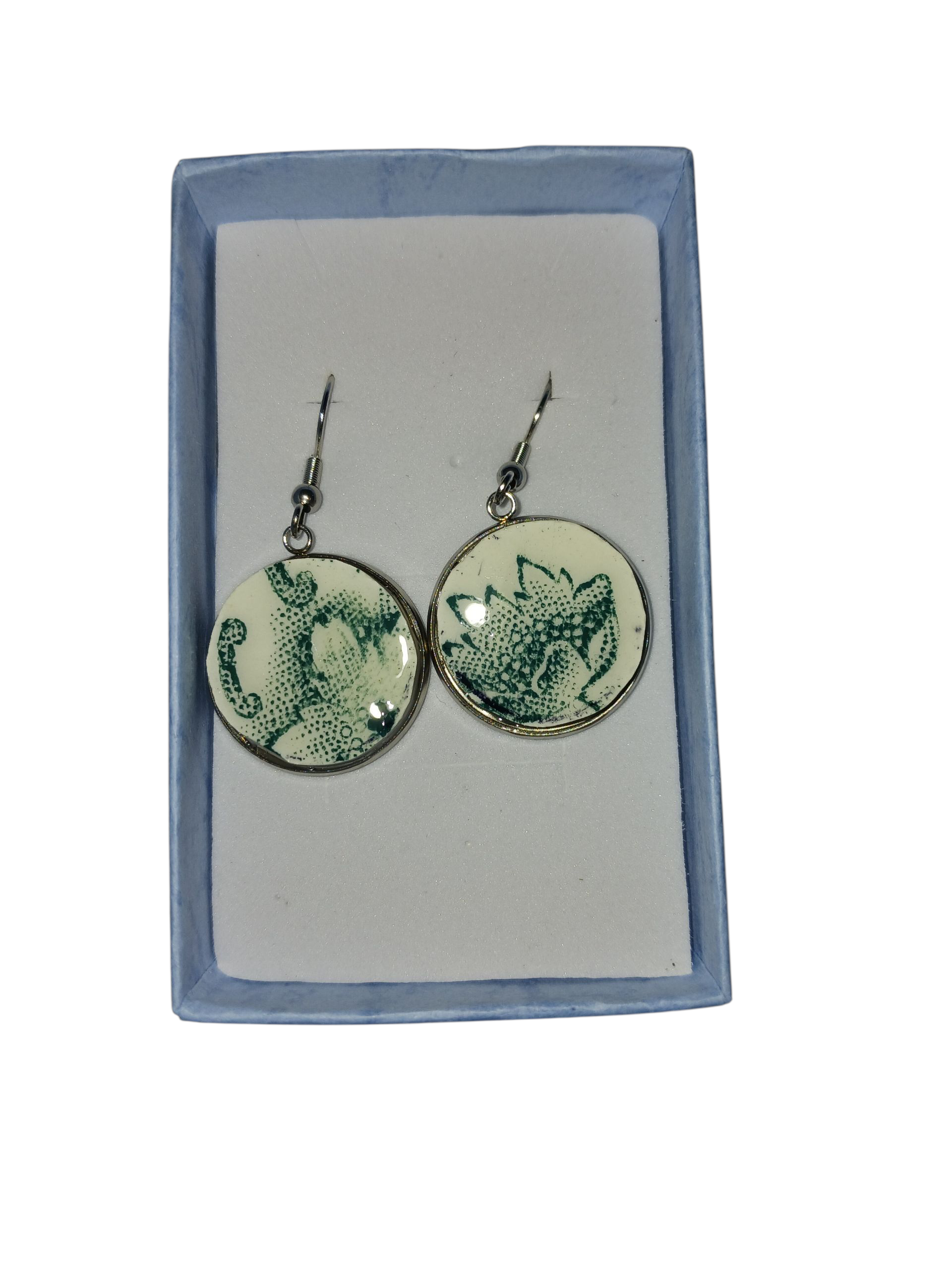 Boucles d'oreilles en acier inoxydable avec morceau de vaisselle fleurie recouvert de résine pour une meilleure protection.
