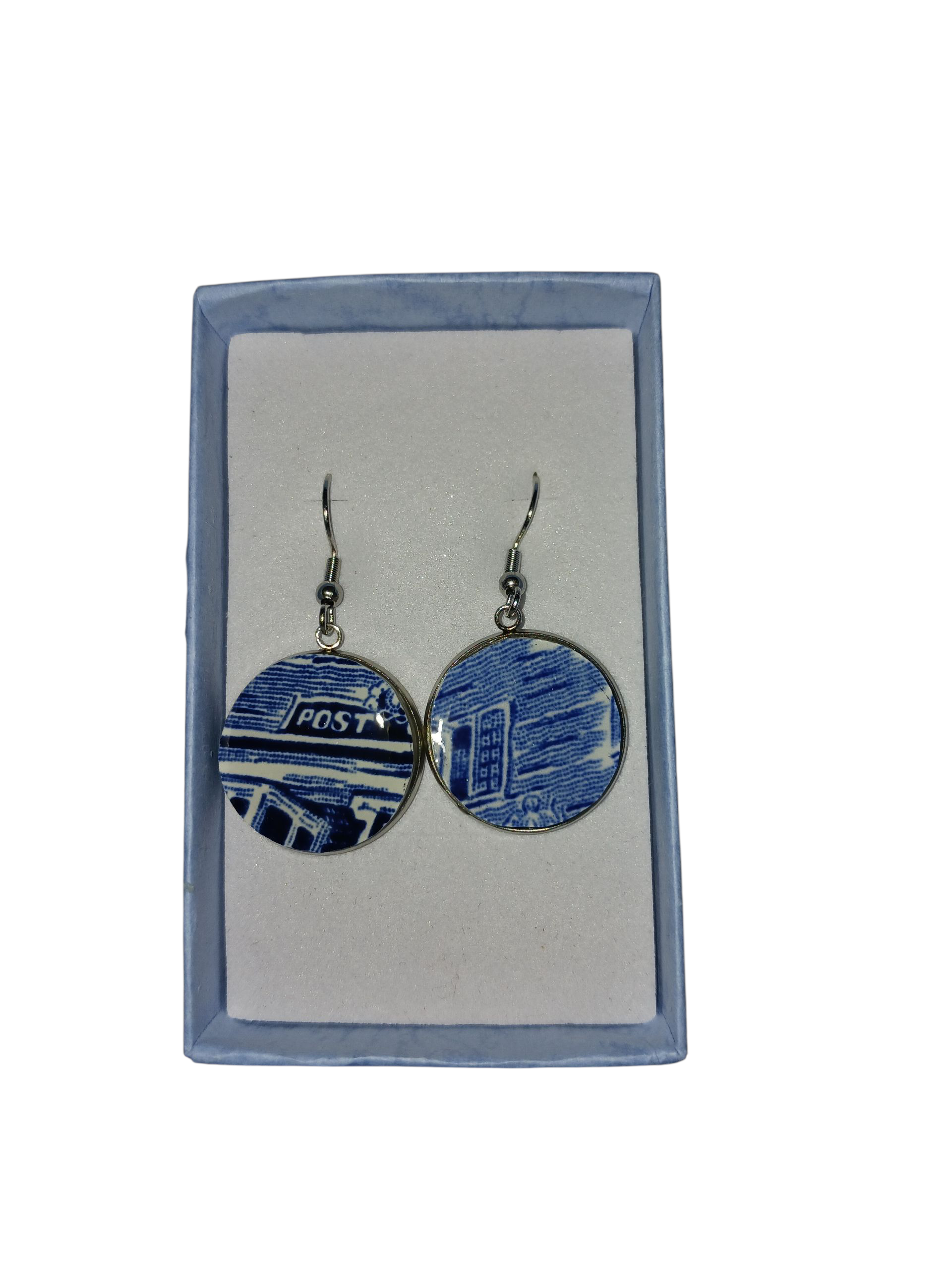 Boucles d'oreilles en acier inoxydable avec morceau de vaisselle fleurie recouvert de résine pour une meilleure protection.