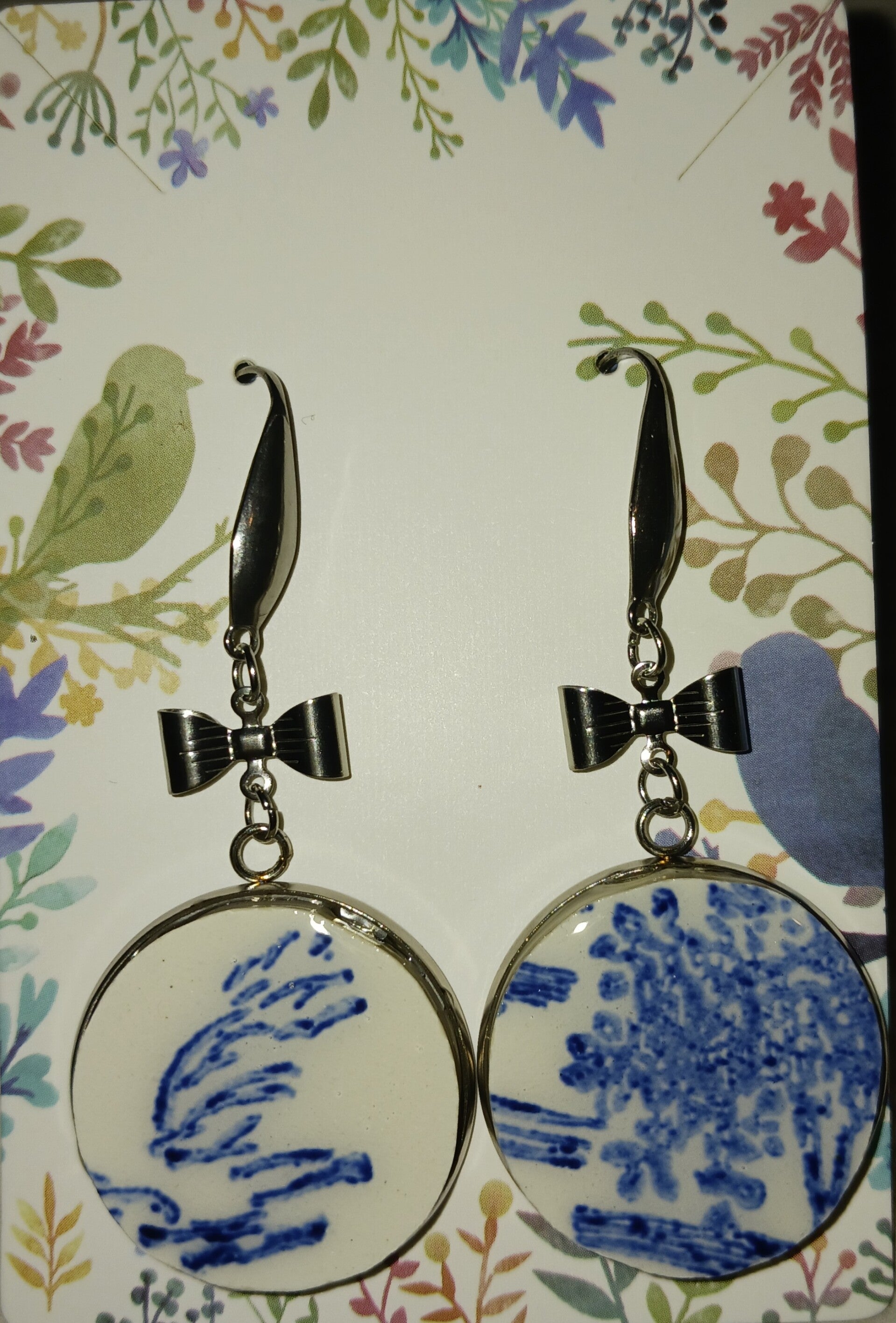 Magnifique boucles d'oreilles en acier inoxydable avec morceau de vaisselle style anglais recouvert de résine.