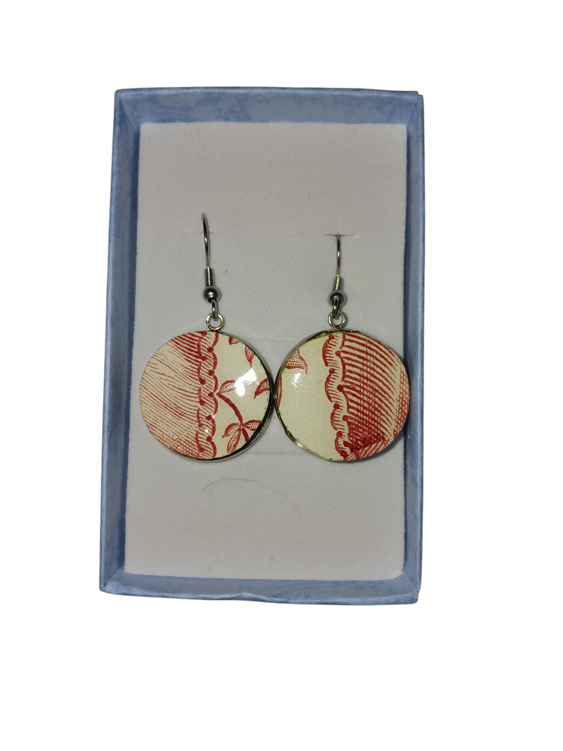Boucles d'oreilles en acier inoxydable avec morceau de vaisselle ancienne rose recouvert de résine pour une meilleure protection.