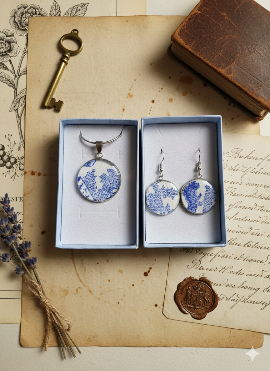 ​Laissez-vous envoûter par le charme singulier de notre nouvelle parure "Azur Antique". Entre tradition et modernité, cet ensemble capture l’essence de la faïence classique pour en faire un bijou contemporain à la fois graphique et délicat.